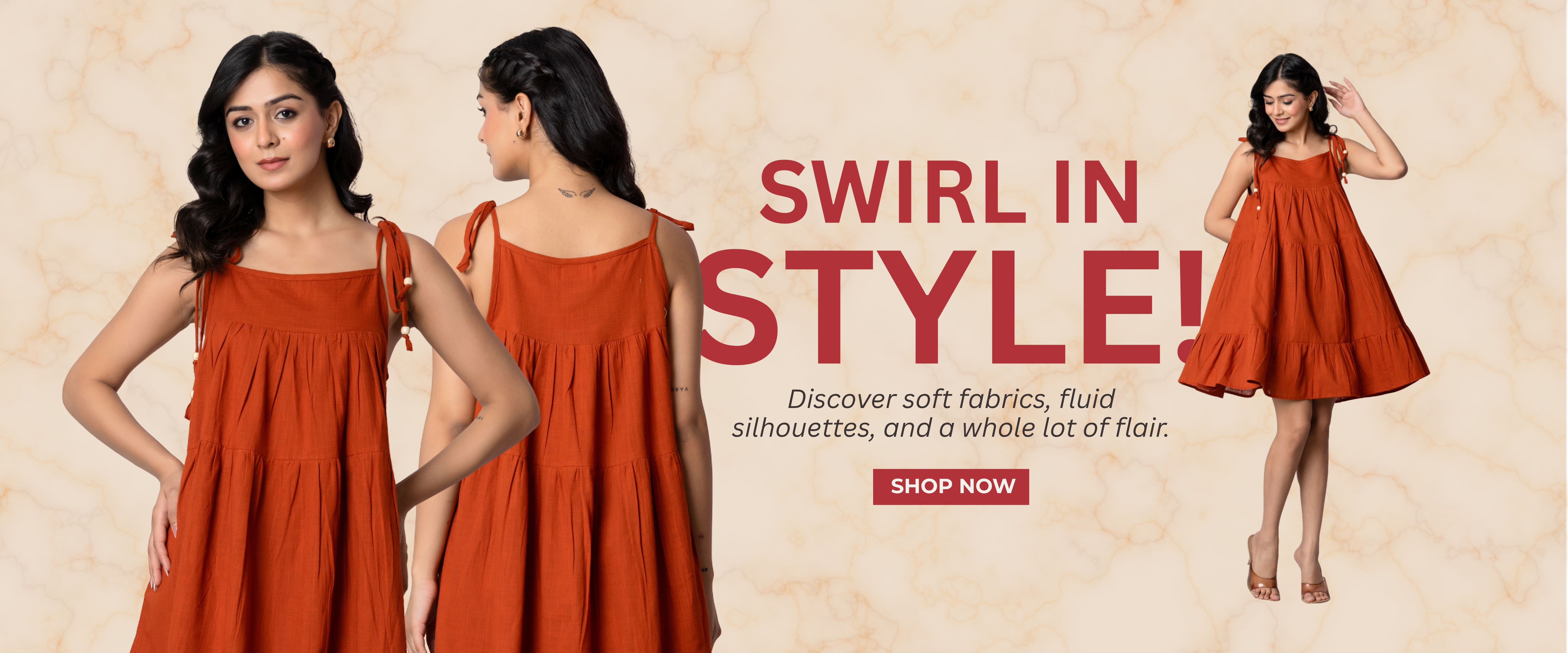 Red & White Swirl Print Cotton Short Dress with Lace Neck Detailing